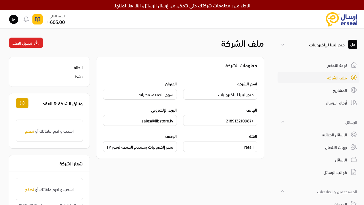 "الرجاء ملء معلومات شركتك حتى تتمكن من إرسال الرسائل، انقر هنا لملئها."